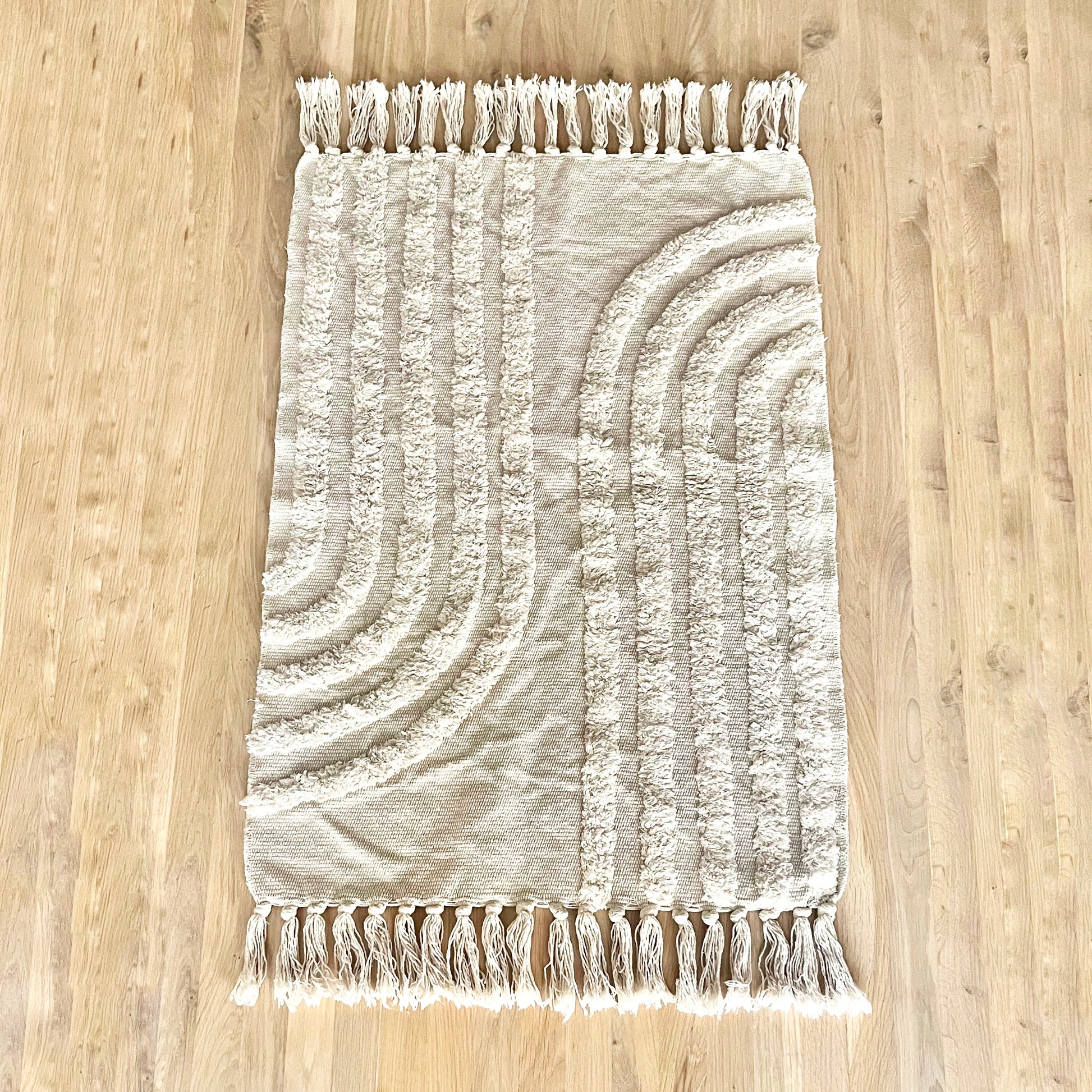 Avec sa teinte douce et ses jolis détails, ce tapis beige est idéal pour ajouter une touche chaleureuse à votre intérieur. Ses surpiqûres élégantes et ses pompons lui donnent un charme unique, parfait pour un salon, une chambre ou même une entrée.